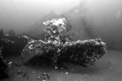 The vis on the wreck was 20 feet or so and I was having fun playing with my camera when all of a sudden it went from nice and bright (I didnt even have my light on) to dark as night. I thought "hmm that can't be good". Soon after, the rumble of engines clued in me into the fact that we might no longer be attached and sure enough the topside conditions had deteriorated as a squall moved through. The winds (I was later told) had quickly kicked up to 35-40 knots which brewed up some good 6 foot or better seas which had been enough to rip a large chunk of the wreck out. I worked my way back to the tie-in and sure enough a sizable portion of the Glory had gone missing (along with the anchor line). I cleaned up my toys and fired off a bag and managed to time my surfacing to be right after the storm passed. Just shows how quickly things can change in the North Atlantic.